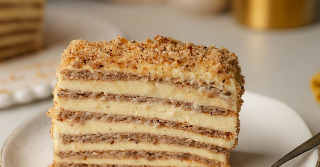 Izmiješaj ohlađenu kremu, pa počni slagati slojeve – biskvit, krema, biskvit, krema, sve dok ne potrošiš sve slojeve biskvita. S ostatkom kreme i lješnjaka ukrasi vanjski dio torte.