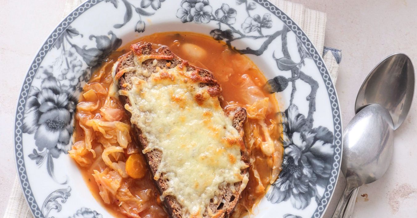 Zagrij pećnicu na 200 stupnjeva. Posloži šnite kruha na juhu, posipaj je ribanim sirom te sve stavi u pećnicu samo da se kruh tostira, a sir otopi.