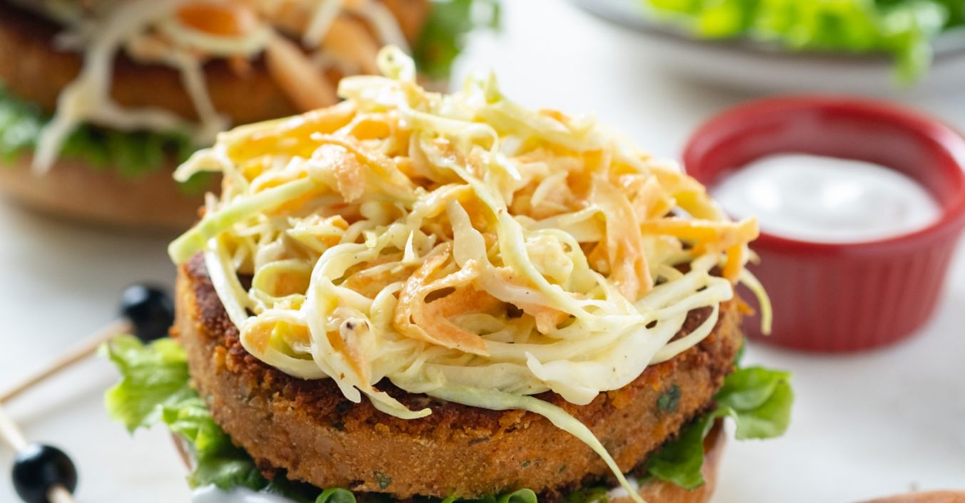 Donji dio peciva premaži majonezom, dodaj listove zelene salate, na njih stavi burgere od leće, a na vrh salatu od kupusa i mrkve te posluži.