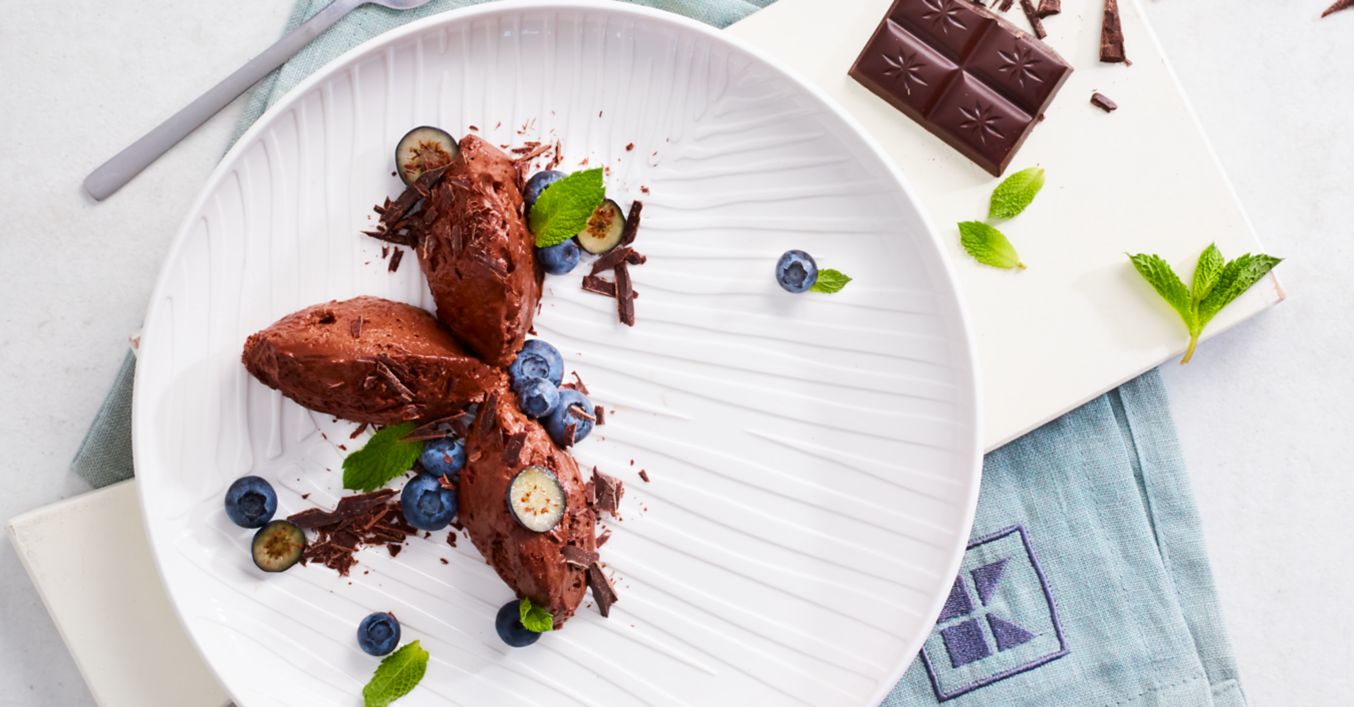 Probrati borovnice, pažljivo oprati i ostaviti da se ocijede. Oprati metvicu, otresti i otkinuti listove. Preostalu čokoladu krupnije naribati. Veganski čokoladni mousse ukrasiti borovnicama, metvicom i ribanom čokoladom te poslužiti.