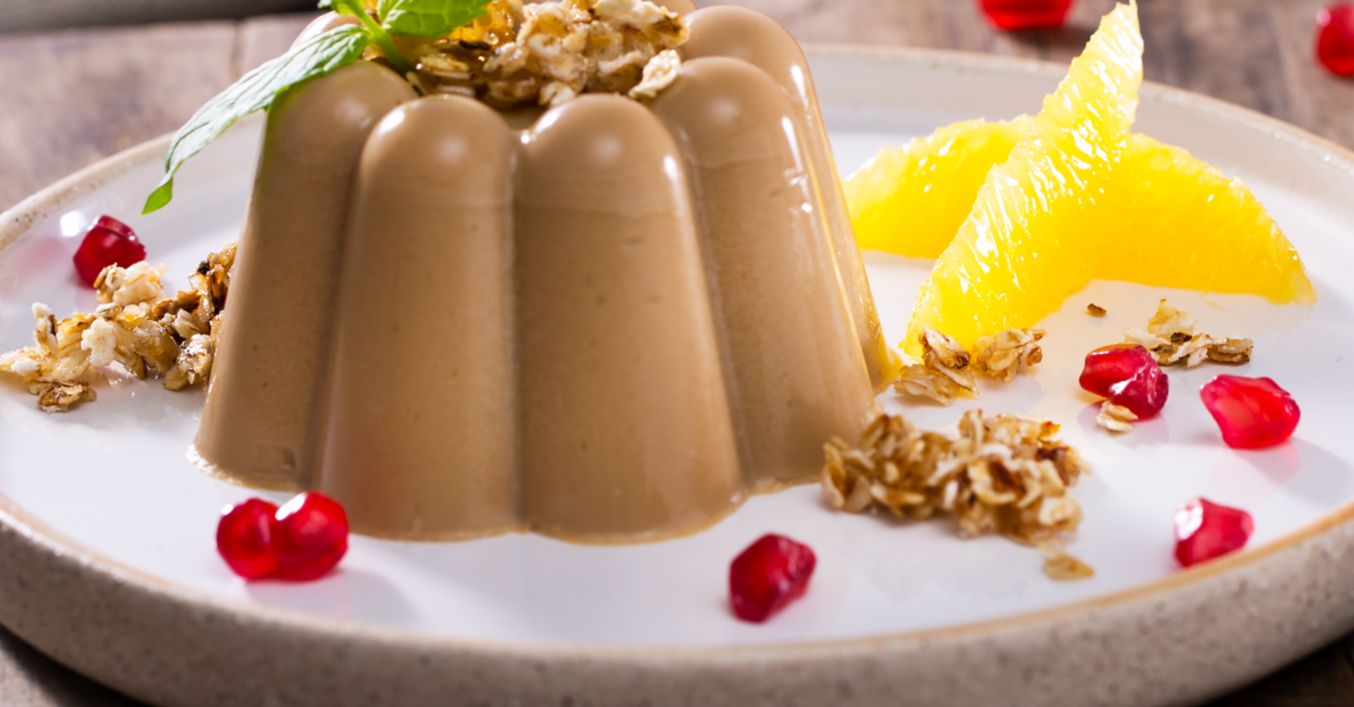 Izvadi puding iz silikonskih kalupa i pospi ga karameliziranim zobenim te posluži sa svježim voćem.