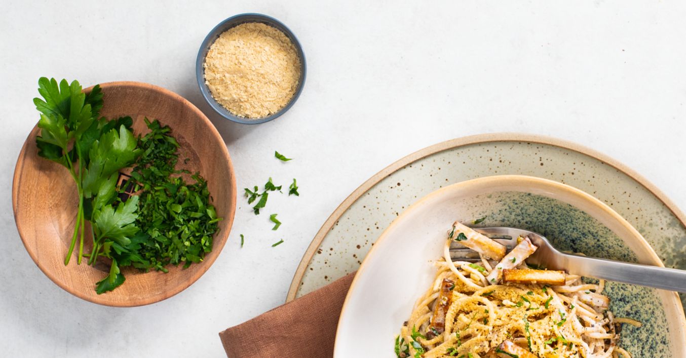 Zagrijati ulje u tavi i u njemu pržiti tofu oko 3 minute dok ne postane hrskav. Dodati kockice luka i kratko popržiti. Uliti vrhnje za kuhanje i kuhati na laganoj vatri oko 2 minute. Dodati špagete, pahuljice kvasca i peršin te kratko prokuhati. Začiniti solju i paprom te posuti pahuljicama kvasca.