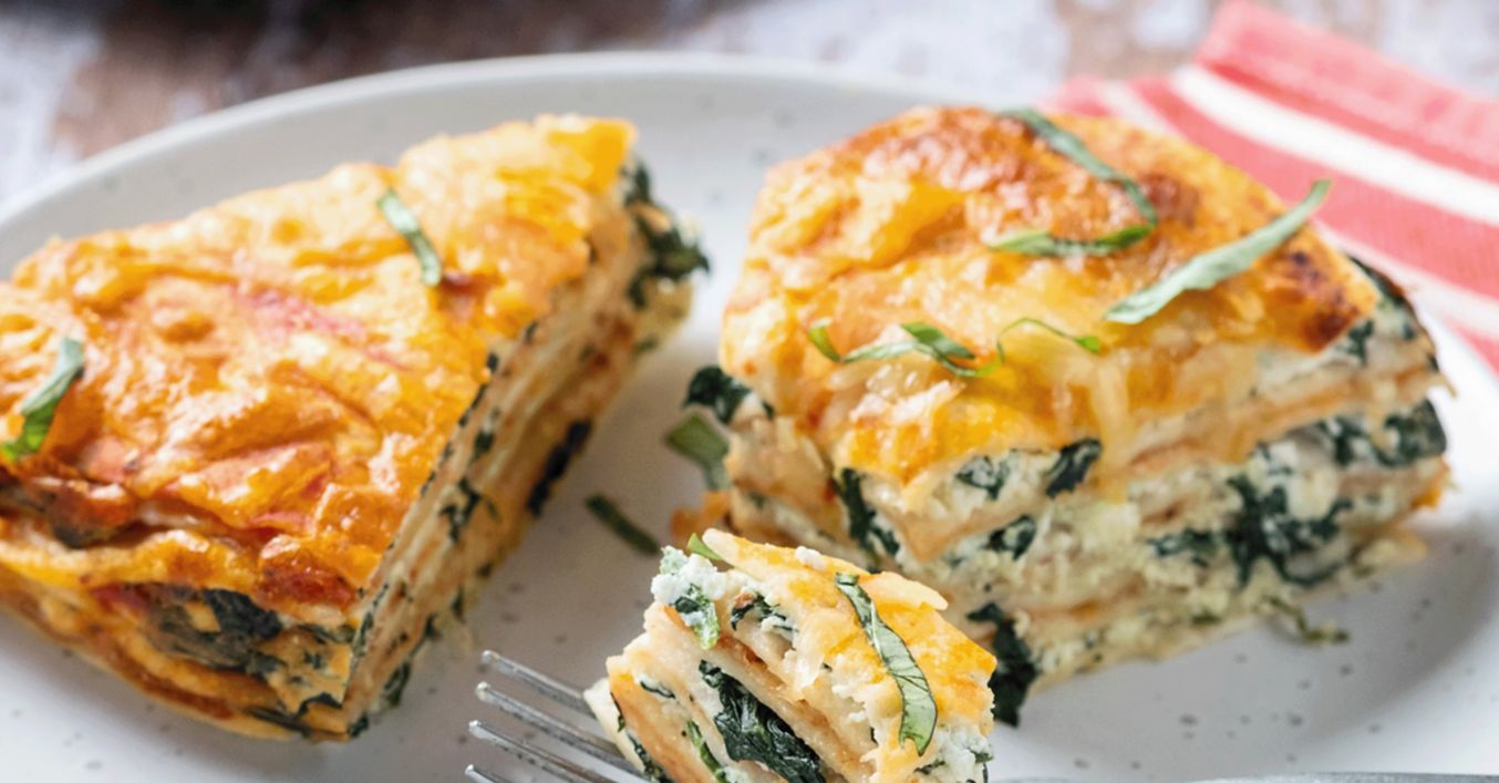 Preostalih šest tortilja potroši tako da ih slažeš prema gore te naizmjenično premazuješ smjesom od sira i špinata ili passatom s mozzarellom. Zadnji sloj treba biti premazan passatom i posut ribanom mozzarellom.