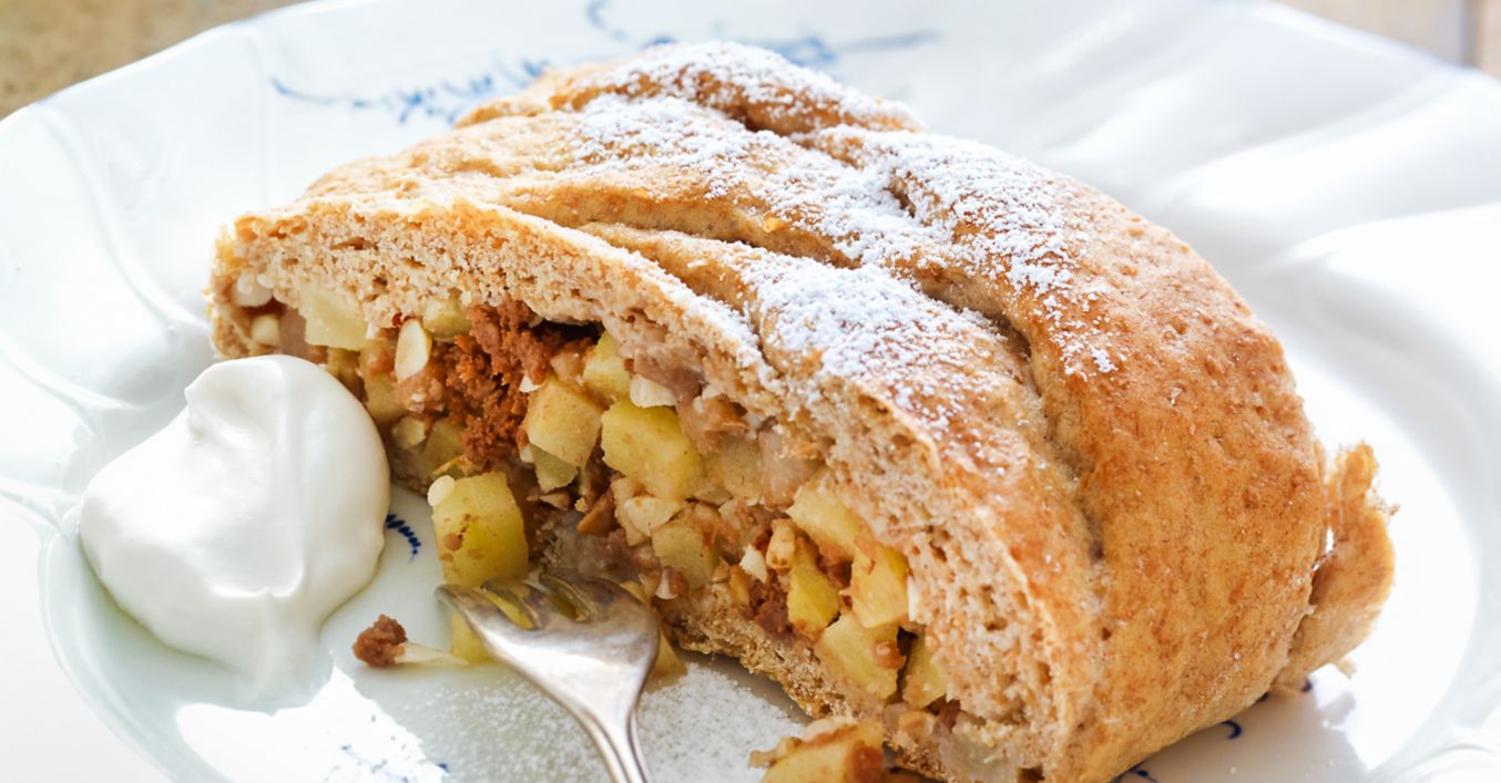 Ostavite da stoji još 30 minuta. Za nadjev pomiješajte usitnjene kekse te komadiće krušaka i jabuka. Tijesto razvaljajte u kvadratni oblik (30 x 40 cm) i stavite u posudu za pečenje obloženu masnim papirom. Rubove s lijeve i desne strane narežite na deblje trake.