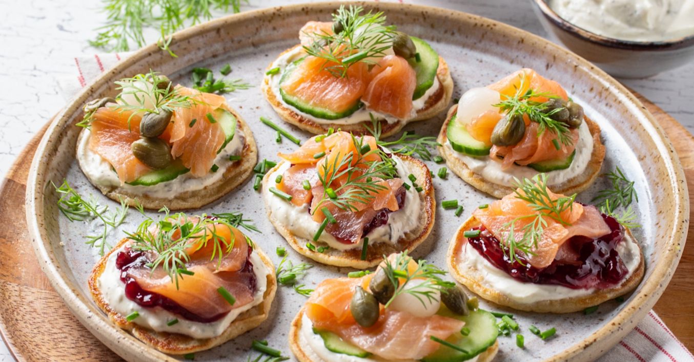 Svaku palačinku premaži namazom od sira pa dalje dodaj sastojke po želji. Mi smo radili dvije vrste zalogaja, jedne s lososom, krastavcem, kaparima i lučicama, a druge s namazom od trešanja i lososom.