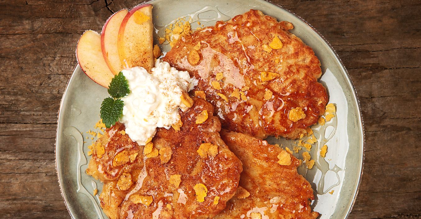 Palačinke prelij s malo meda, pospi cimetom i conrflakesom te posluži sa žličicom-dvije svježeg zrnatog sira.