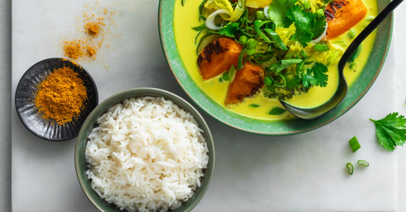 Rižu skuhati prema uputama na pakiranju u lagano posoljenoj vodi. Zagrijati ulje u loncu i pirjati ljutiku, češnjak, đumbir, čili papričice, brokulu, tikvicu i celer na srednje jakoj vatri oko 3 minute. Dodati curry u prahu i također kratko propirjati. Uliti kokosovo mlijeko, povrtni temeljac i agavin sirup te kuhati oko 10 minuta. Na polovini kuhanja dodati mladi luk i grašak. Dobro zagrijati grill tavu na jakoj vatri i kratko popeči polovice marelica uz okretanje tako da ostanu vidljivi tragovi grila. Nakon toga marelice prepoloviti ili izrezati na trećine.