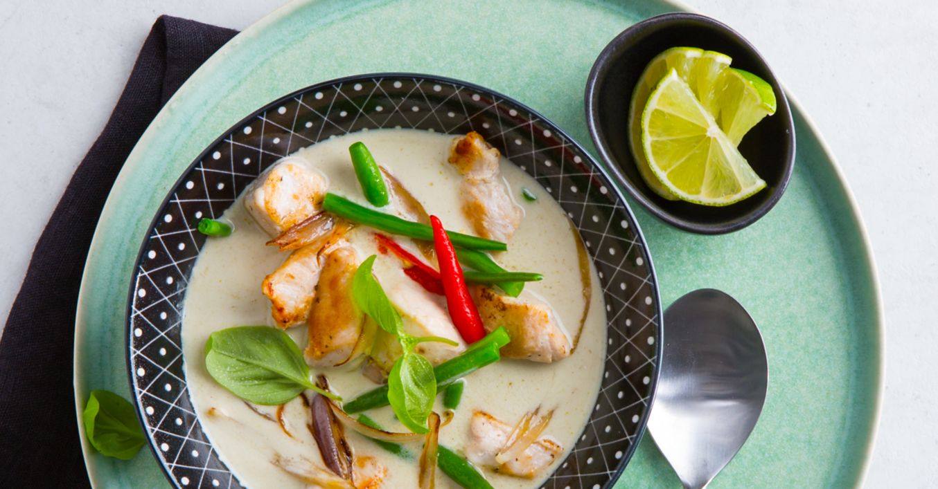 Curry pastu kratko zapeci na vrućem ulju u tavi. Dodaj polovicu količine kokosova mlijeka, a zatim dodaj piletinu i peci oko tri minute. Na kraju umiješaj sok i koricu limete.