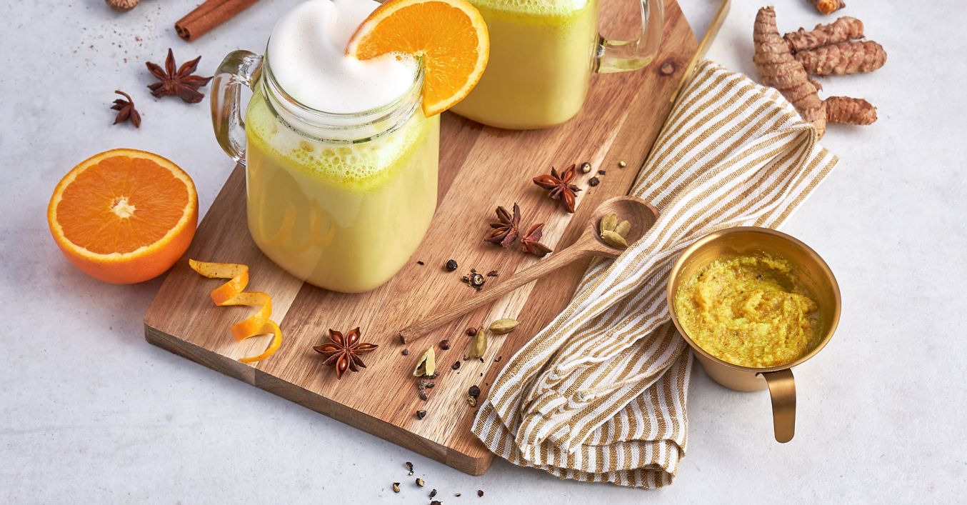 Za mlijeko, naranlu isperi pod mlazom vruće vode, naribaj malo korice (jednu žličicu) i potom iscijedi sok. U lončiću pomiješaj sok od naranče i biljni napitak, umiješaj kremu te pjenjačom miješaj dok ne dobiješ pjenu. Dodaj agavin sirup i naribanu koricu naranče. Dobievni napitak rasporedi na šest čaša te ukrasi pripremljenom pjenom, kriškama naranče i cimetom.